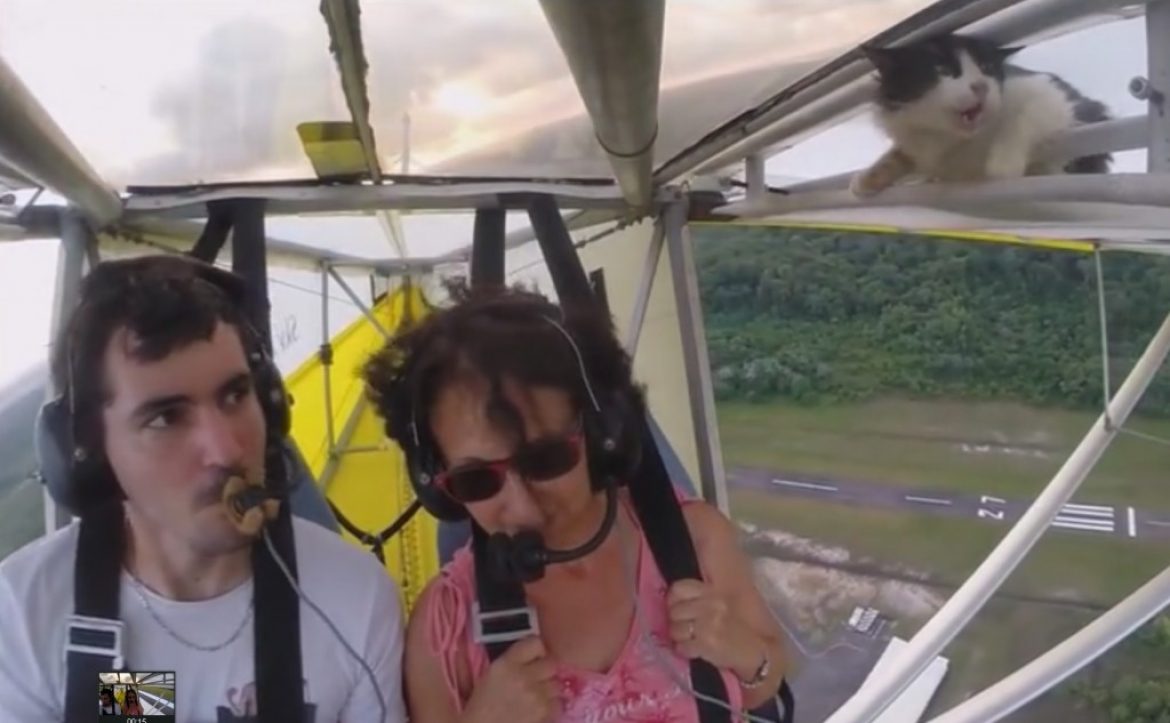 Ce pilote réalise un baptême de l'air en ULM à Kourou en Guyane Française. Après le décollage, le pilote découvre un chat qui était resté sur une aile.