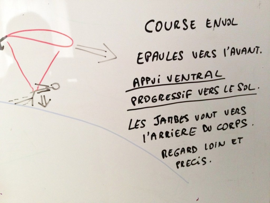 NB : C’est bien le poids qui est la priorité et non la course dans la phase d’envol. Ce sont bien les épaules qui s’engagent vers l’avant et non les bras qui vont derrrière (les bras se retrouvent tendus derrière car les épaules ont avancé et non pas l’inverse). La technique du « Chicken Run » permet de charger progressivement la voile tout en courant et pilotant.