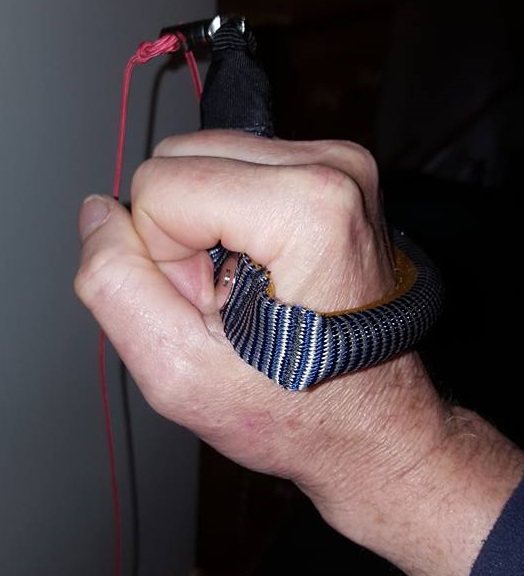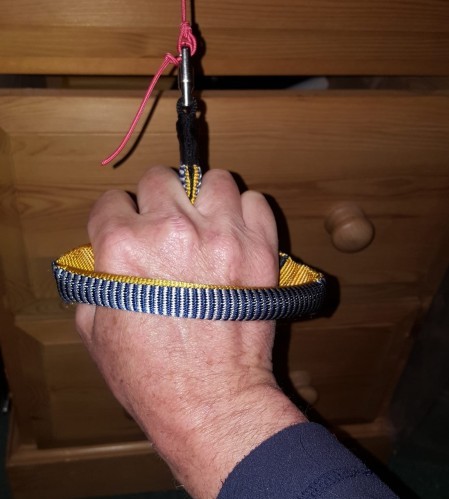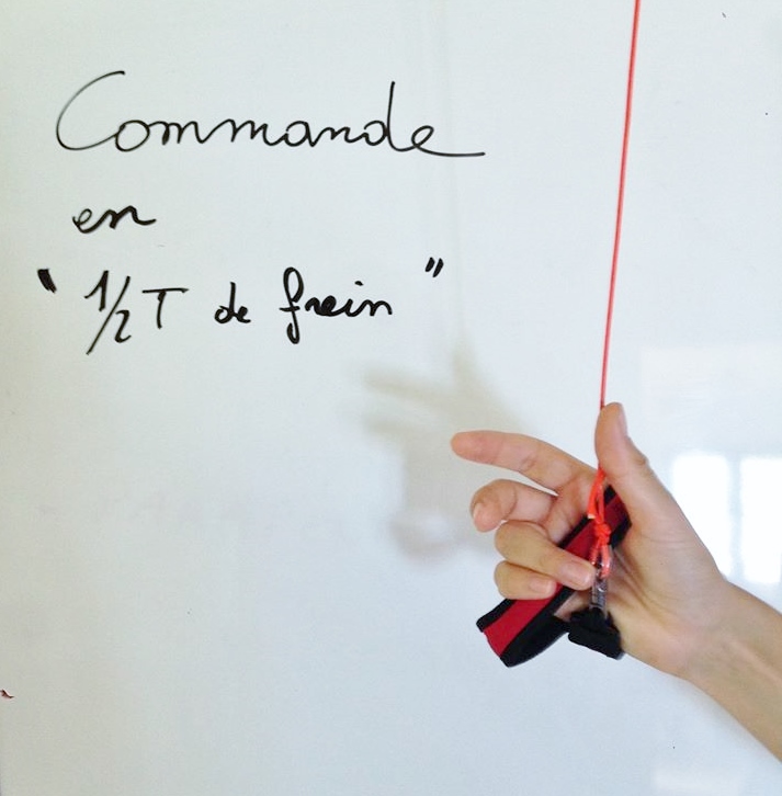 Le demi tour de frein autour de sa main. La tension a lieu sur le tranchant inférieur de la main.