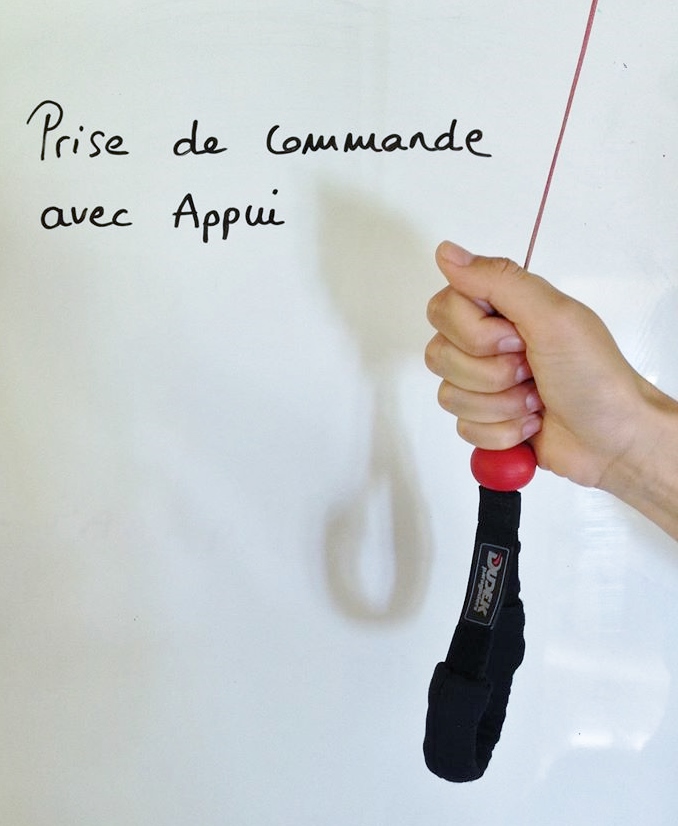 On passe la main à l’intérieur de la commande puis on tient le haut de la commande entre le pouce et l’index en général. D’où l’intérêt d’un appui rigide (boule, barre) qui permet à la main de ne pas tétaniser sur les vols longs si le pilote a tendance à serrer la commande.