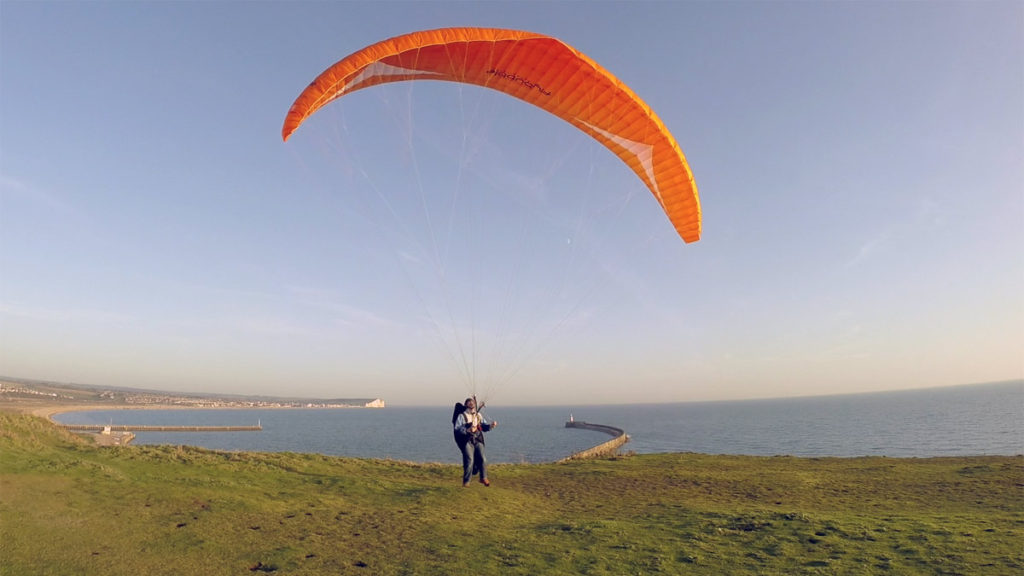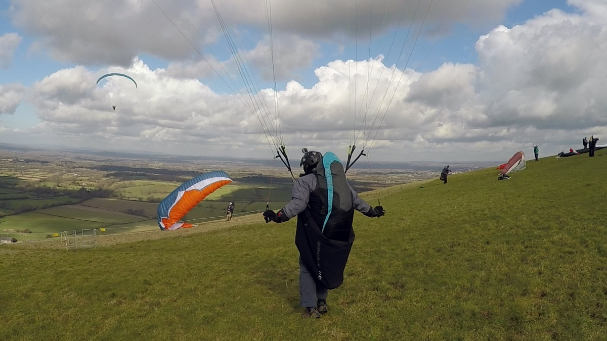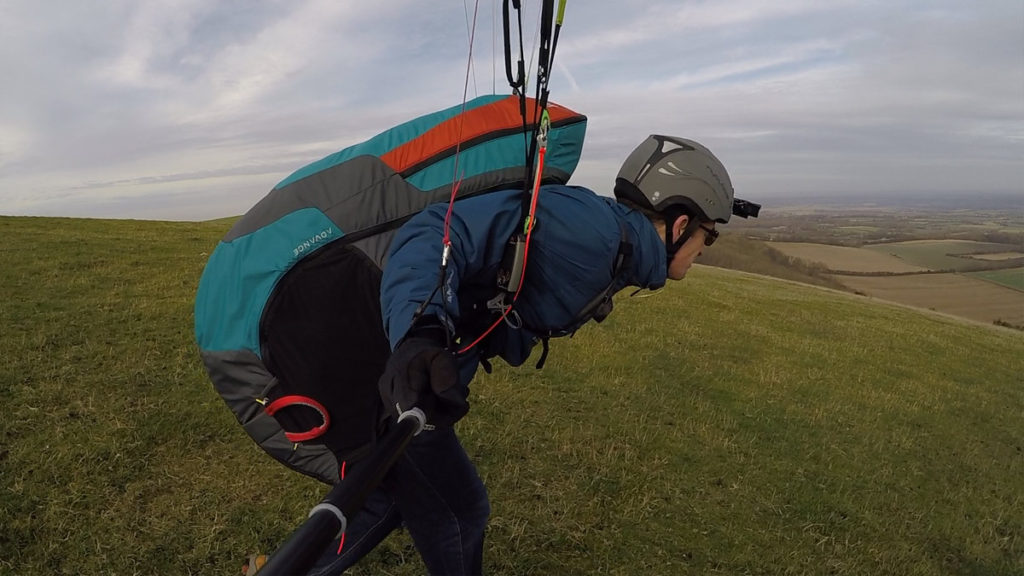L’appui sur la ventrale avant de courir permet d’éviter que la sellette ne glisse le long de tes jambes mais cela permet aussi d’avoir une meilleure connexion avec l’aile (plutôt que d’avoir une position debout). Essaie de charger la sangle ventrale en augmentant la pression jusqu’à la vitesse de vol et essaie de couvrir sur une distance minimale.