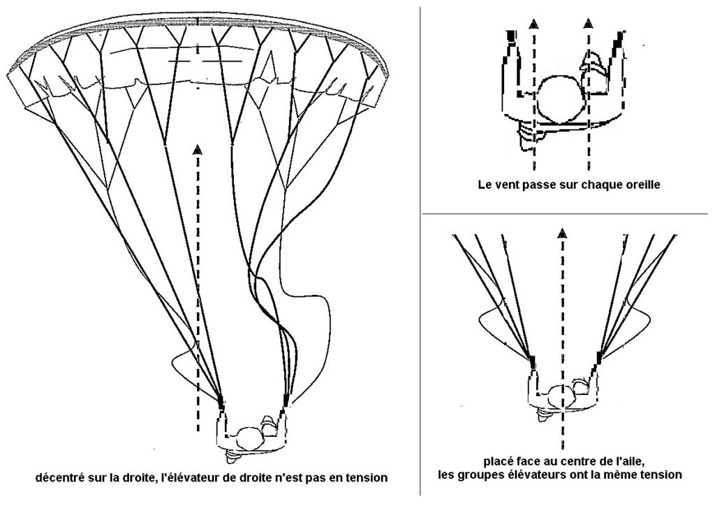 Pour un gonflage symétrique, place-toi bien dans l’axe du vent, au centre de ton aile avec la voile bien perpendiculaire au vent. Les deux groupes maillons/élévateurs doivent avoir la même tension de part et d’autre (preuve que ton bassin est symétrique et que tu es bien centré par rapport à ton aile). Un mauvais centrage et une dissymétrie du bassin occasionnera un gonflage asymétrique (voir illustrations à gauche). Si tu es bien axé par rapport au vent, tu dois « entendre » le vent passer dans chaque oreille.