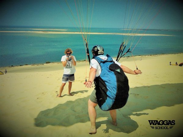 Utilise aussi des gants car il est facile de se brûler les mains et les doigts avec les suspentes. Et utilise tes chaussures de parapente ou des chaussures de sport mais surtout pas des sandales car si tu es traîné, tu peux te faire mal aux pieds à cause d’obstacles sur le sol (pierre, objets, racines, détritus – tous les décos ne sont pas comme la Dune du Pyla !)