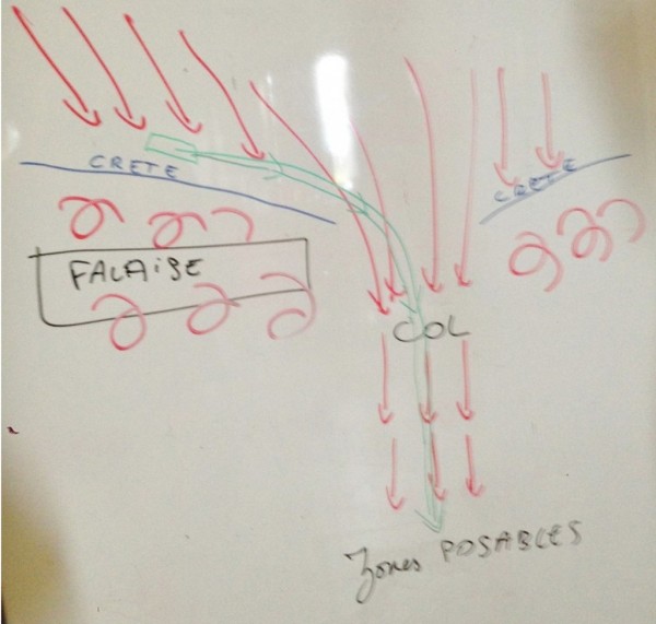 – passer derrière le relief au niveau des falaises, zone la plus potentiellement turbulente car le relief s’affaisse brutalement donc entrainant une grosse perturbation de la masse d’air en mouvement,