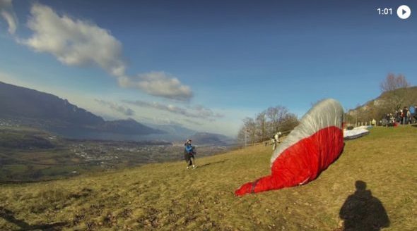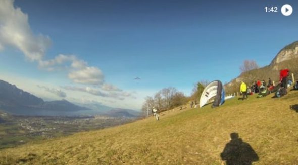 On est en hiver, le gradient thermique (entre la plaine et le déco) est très marqué donc la masse d’air est instable. On remarque des cumulus dans le ciel et le vent de Nord dans la vallée de Chambéry est marqué, ce vent rafraîchit encore la masse d’air (le vent du Nord se remarque dans la vidéo : après le décollage le pilote doit s’orienter vers la droite pour se mettre face au vent). Donc c’est un contexte de thermique potentiellement fort. Et avec du vent de Nord, le thermique se forme quasiment sous le vent (la falaise est plutôt orientée Ouest Nord Ouest).