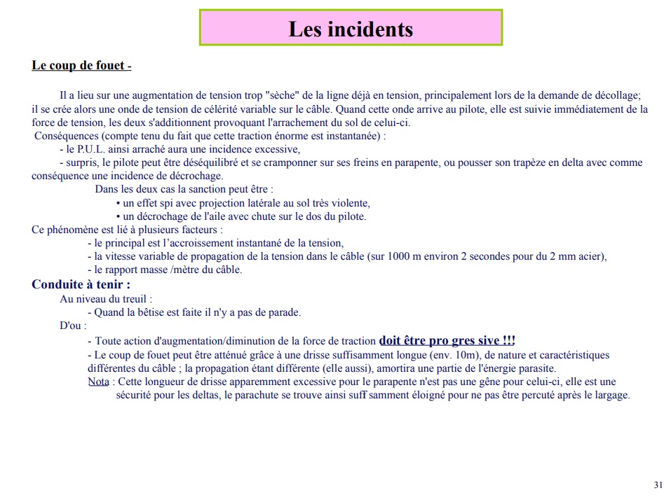 Cela se produit quand il y a une augmentation de tension trop « sèche » de la ligne déjà en tension. Il se crée alors une onde de tension sur le câble. Quand cette onde arrive au pilote, elle s’additionne à la force de tension provoquant ainsi l’arrachement du pilote du sol (voir fiche FFVL).