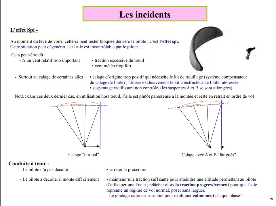 L’effet spi, c’est quand la voile reste bloquée derrière le pilote au lever de voile. Cette situation peut dégénérer car l’aile est incontrôlable par le pilote (voir fiche FFVL).