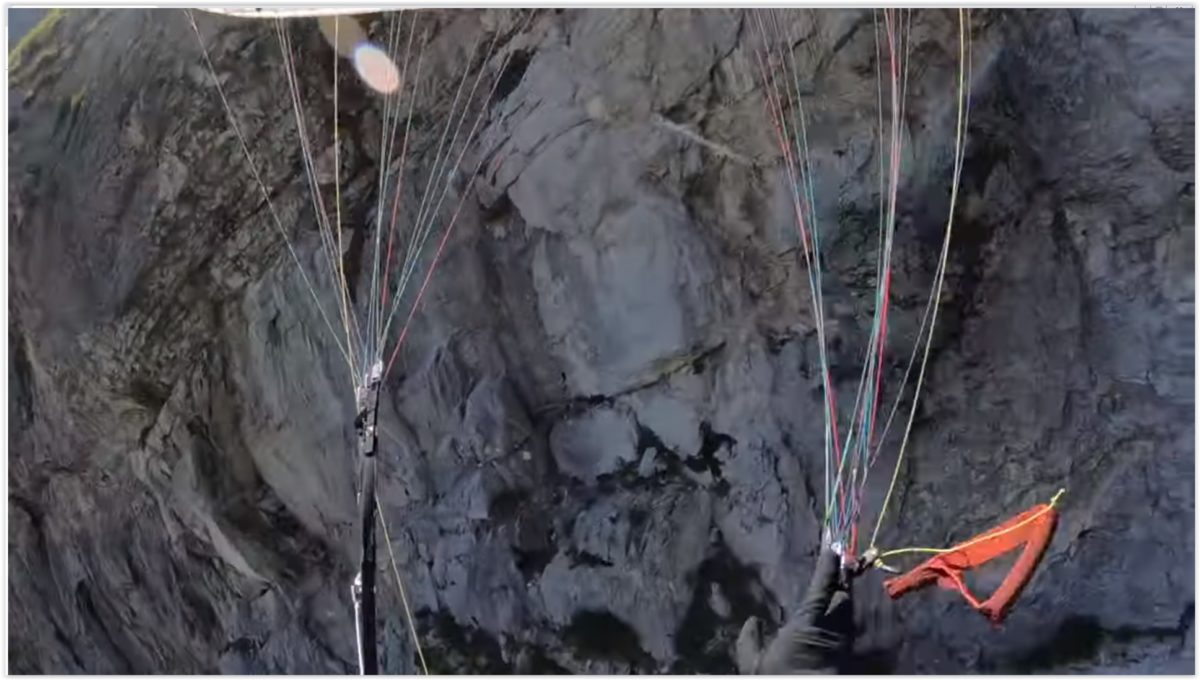 On remarque qu’à un moment le pilote lâche ses commandes : volontairement pour tirer son secours ? Involontairement car les mouvements de voiles sont violents ? On remarque que la voile peut alors revoler, forte abattée avec cravate puis cascade d’incidents jusqu’à l’impact ! La suite avec les images.