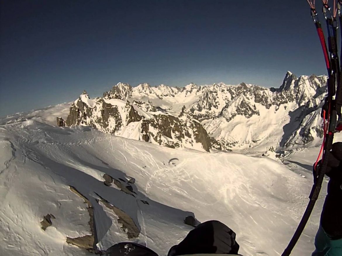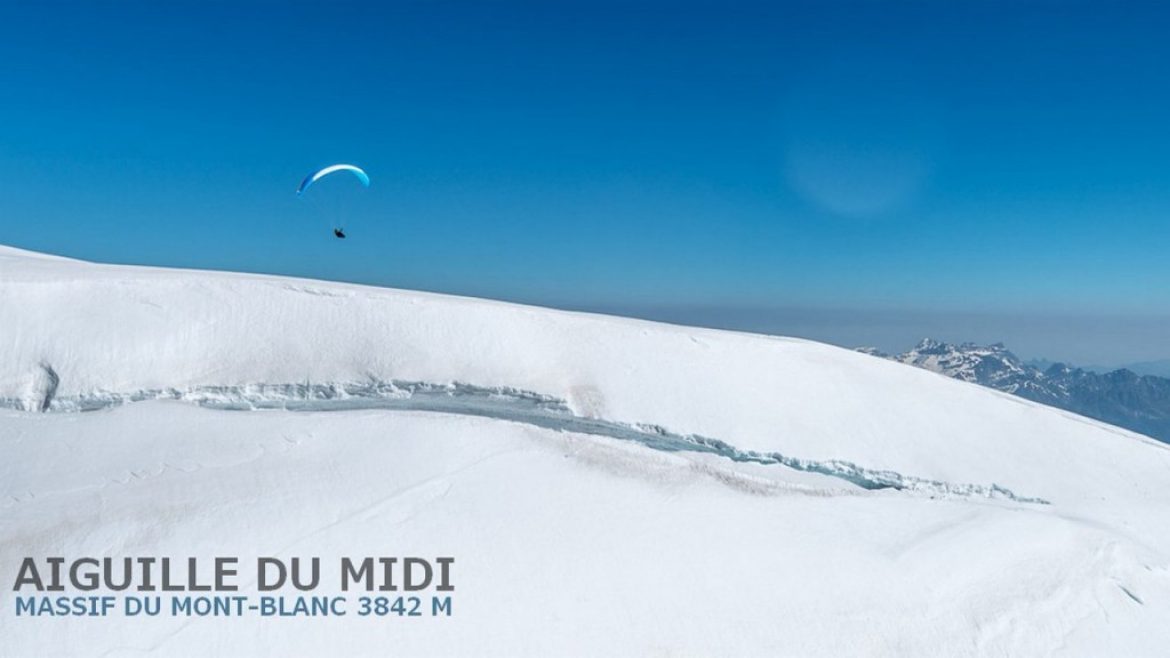 Un joli périple de Julien Irilli avec ses amis : départ de Chamonix à 8h15 pour le Mont Blanc, décollage de l'Aiguille du Midi puis de l'Aiguille Verte
